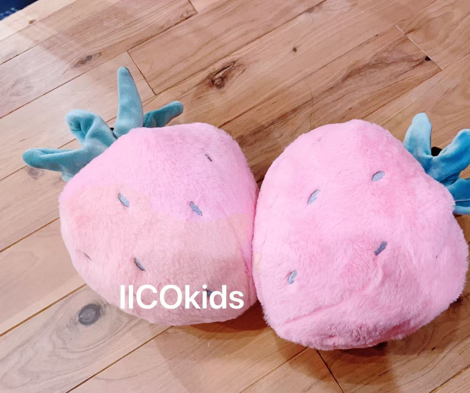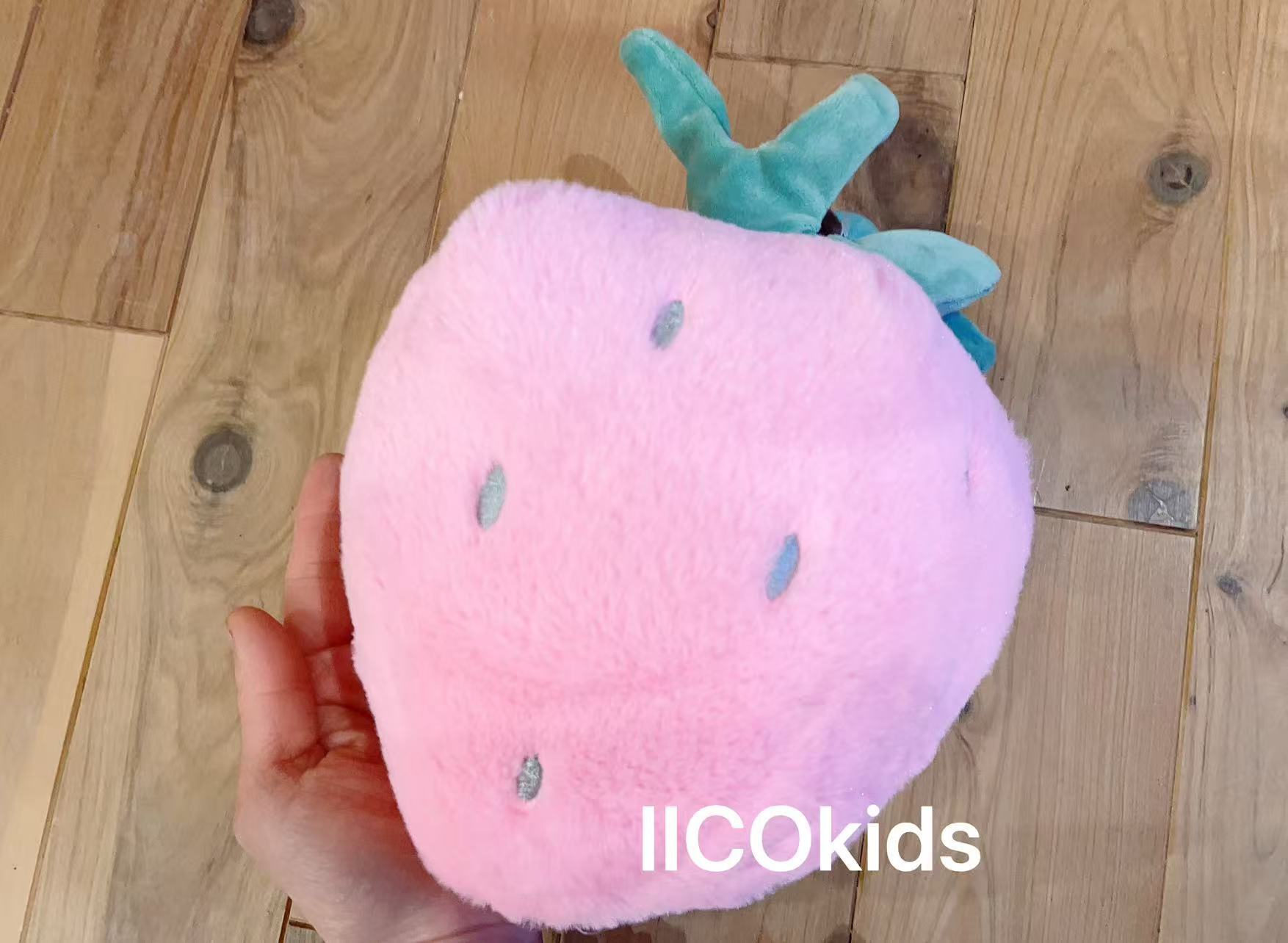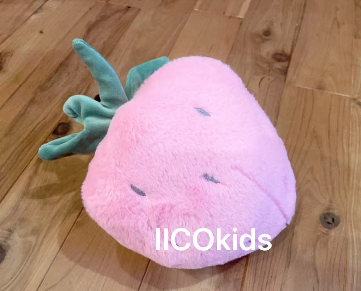 ふわふわで大きめの、ピンク色のいちごのぬいぐるみです。